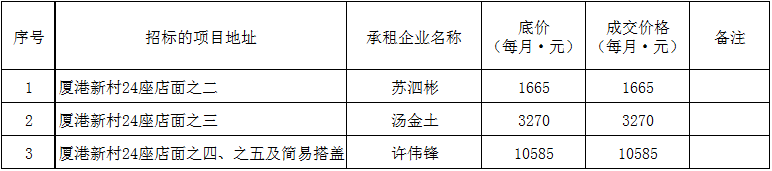 根據(jù)思明區(qū)國(guó)有企業(yè)資產(chǎn)出租管理的相關(guān)制度,我司2019年5月28日上午9:00起于觀音山營(yíng)運(yùn)中心2號(hào)樓2層2號(hào)會(huì)議室進(jìn)行公開招租現(xiàn)場(chǎng)開標(biāo),現(xiàn)通過(guò)思明控股網(wǎng)站對(duì)外發(fā)布成交公告,內(nèi)容如下: