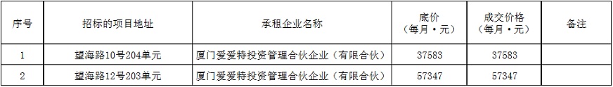 根據(jù)思明區(qū)國(guó)有企業(yè)資產(chǎn)出租管理的相關(guān)制度,我司2019年5月10日上午9:00起于觀音山營(yíng)運(yùn)中心2號(hào)樓2層2號(hào)會(huì)議室進(jìn)行公開招租現(xiàn)場(chǎng)開標(biāo),現(xiàn)通過(guò)思明控股網(wǎng)站對(duì)外發(fā)布成交公告,內(nèi)容如下:
