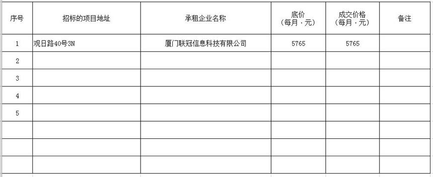根據(jù)思明區(qū)國(guó)有企業(yè)資產(chǎn)出租管理的相關(guān)制度,我司2020年5月8日上午9:00起于觀音山營(yíng)運(yùn)中心2號(hào)樓2層2號(hào)會(huì)議室進(jìn)行公開(kāi)招租現(xiàn)場(chǎng)開(kāi)標(biāo),現(xiàn)通過(guò)思明控股網(wǎng)站對(duì)外發(fā)布成交公告,內(nèi)容如下:
