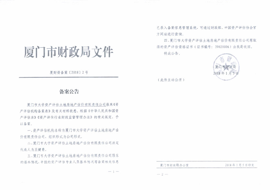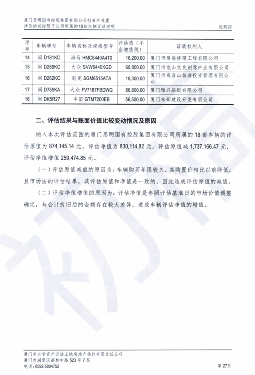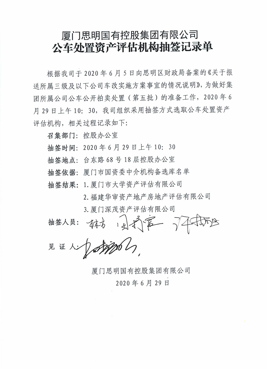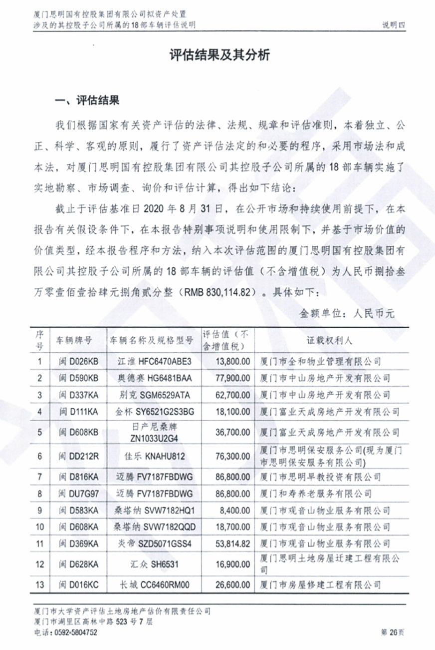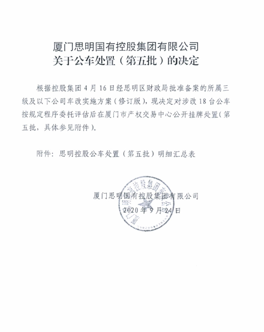 根據(jù)2020年6月5日我司報經(jīng)思明區(qū)財政局批準(zhǔn)備案的《關(guān)于報送所屬三級及以下公司車改實施方案事宜的情況說明》相關(guān)文件精神,我司委托廈門市大學(xué)資產(chǎn)評估土地房地產(chǎn)估價有限責(zé)任公司對公車處置(第五批)的車輛進(jìn)行評估,該公司已于9月30日向我司提交資產(chǎn)評估結(jié)果初稿?,F(xiàn)將評估結(jié)果進(jìn)行公示,如有異議,歡迎來電來函反映。