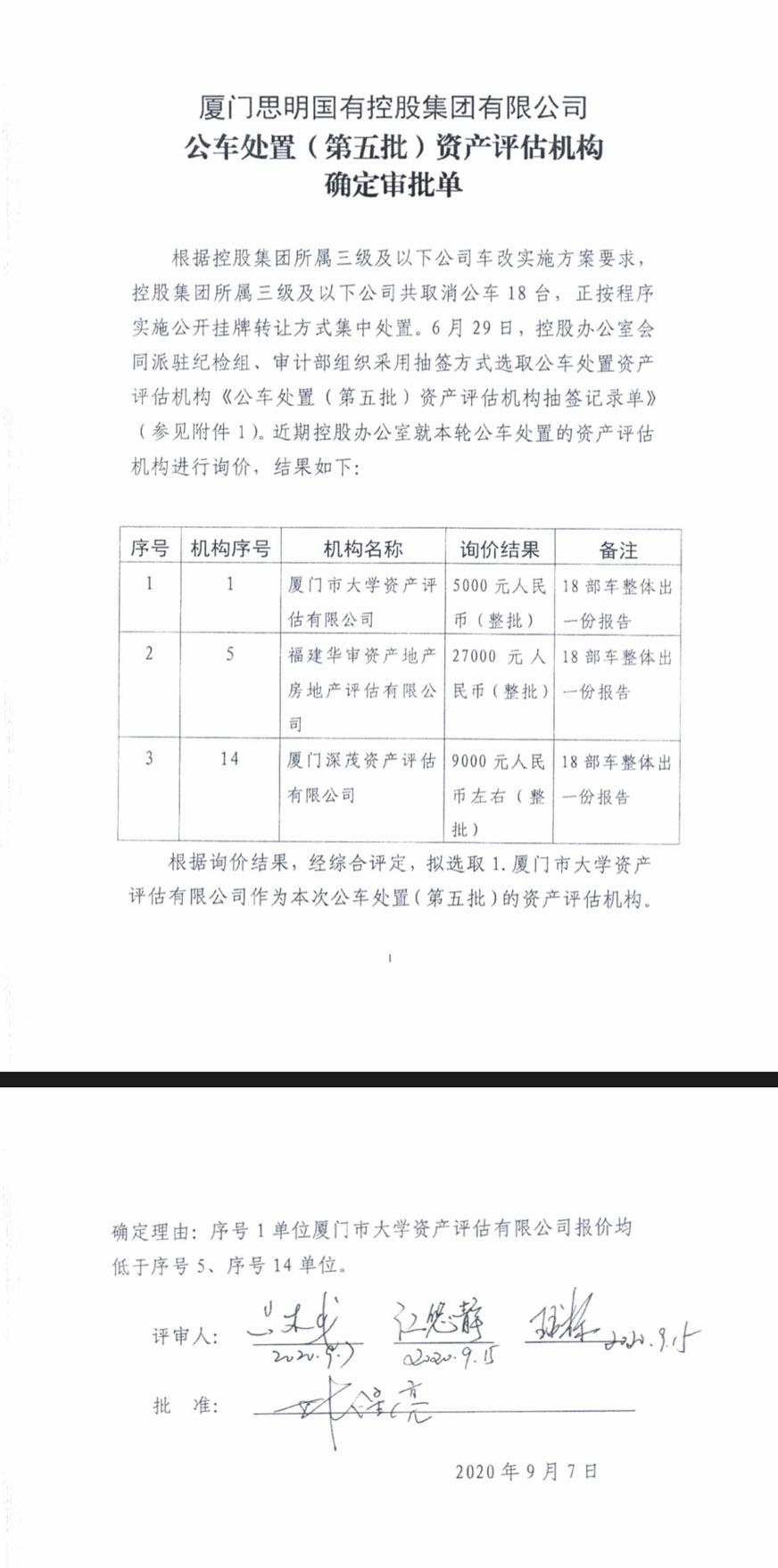 根據(jù)2020年6月5日我司報經(jīng)思明區(qū)財政局批準備案的《關于報送所屬三級及以下公司車改實施方案事宜的情況說明》相關文件精神,我司委托廈門市大學資產(chǎn)評估土地房地產(chǎn)估價有限責任公司對公車處置(第五批)的車輛進行評估,該公司已于11月10日向我司提交資產(chǎn)評估結果?,F(xiàn)將評估結果進行公示,如有異議,歡迎來電來函反映。