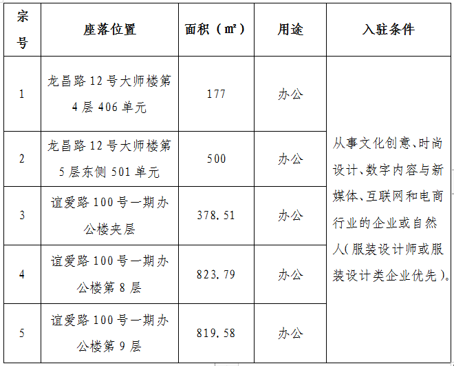 根據(jù)國有企業(yè)資產(chǎn)出租管理相關(guān)制度,我司決定對位于龍昌路12號、誼愛路100號嘉蓮商務(wù)中心下列5宗房產(chǎn)對符合入駐條件的意向承租人進(jìn)行公開競價招租,具體信息如下: