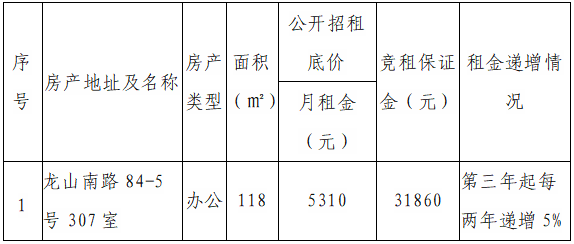 根據(jù)國有企業(yè)資產(chǎn)出租管理相關(guān)制度,我司決定對位于龍山南路84-5號307室房產(chǎn)對符合入駐條件的意向承租人進行公開競價招租,具體信息如下: