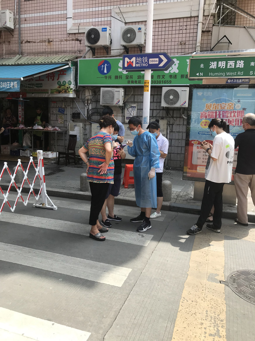 盡管隊(duì)員們幾乎徹夜未眠,31日清晨7點(diǎn),湖明小學(xué)門口,全和第一支抗疫志愿者隊(duì)伍10人全部準(zhǔn)時(shí)集結(jié)到位。在領(lǐng)隊(duì)招商部經(jīng)理邱慧瓊的帶領(lǐng)下,主動(dòng)對(duì)接街道社區(qū)工作人員,領(lǐng)取工作任務(wù)。很快,隊(duì)員們各就各位、迅速上崗,與醫(yī)務(wù)人員、社區(qū)工作人員擰成一股繩:測(cè)量體溫、維持秩序;指引登記、答疑解惑;上門動(dòng)員、分批引導(dǎo),登記錄入,面對(duì)不會(huì)用手機(jī)預(yù)約的老人、預(yù)約條形碼不規(guī)范的群眾,隊(duì)員們細(xì)致耐心地指導(dǎo)、不厭其煩地重復(fù)答疑,用微笑化解疫情之下群眾的焦躁心情,全力協(xié)助核酸檢測(cè)工作,用實(shí)際行動(dòng)踐行國(guó)企擔(dān)當(dāng)。