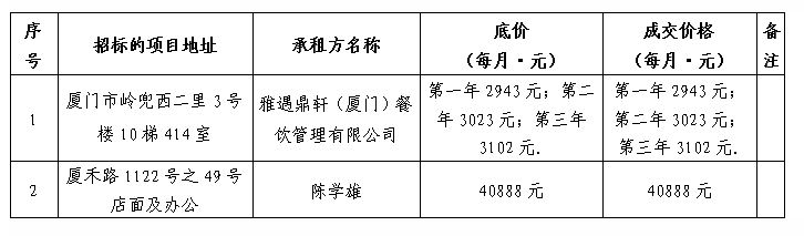 根據(jù)思明區(qū)國有企業(yè)資產(chǎn)出租管理的相關(guān)制度,我司2022年1月25日上午9:00起于廈門市前埔工業(yè)園1號全和公司七樓會議室進(jìn)行公開招租現(xiàn)場開標(biāo),現(xiàn)通過思明控股網(wǎng)站對外發(fā)布成交公告,內(nèi)容如下: