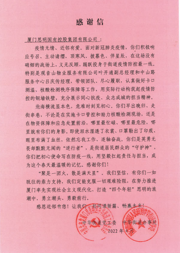 正如中華街道感謝信中所說“聚是一團(tuán)火,散是滿天星”!觀音山物業(yè)團(tuán)隊(duì)始終用堅(jiān)毅扛起責(zé)任與擔(dān)當(dāng),義無反顧,勇毅前行,努力做街道居民群眾的“守護(hù)者”,做美麗廈門幸福思明的“踐行者”。