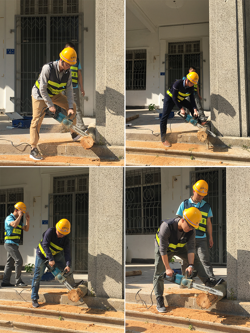 在應(yīng)急搶險(xiǎn)器材中電鋸的操作演練環(huán)節(jié),隊(duì)員們整齊有序,一個(gè)接一個(gè),沒(méi)有過(guò)關(guān)主動(dòng)再操作一次,一轉(zhuǎn)眼功夫,一塊大長(zhǎng)條的原木被隊(duì)員們像切白蘿卜般輕輕松松一塊塊分身落地,場(chǎng)地響起雷鳴般的掌聲。