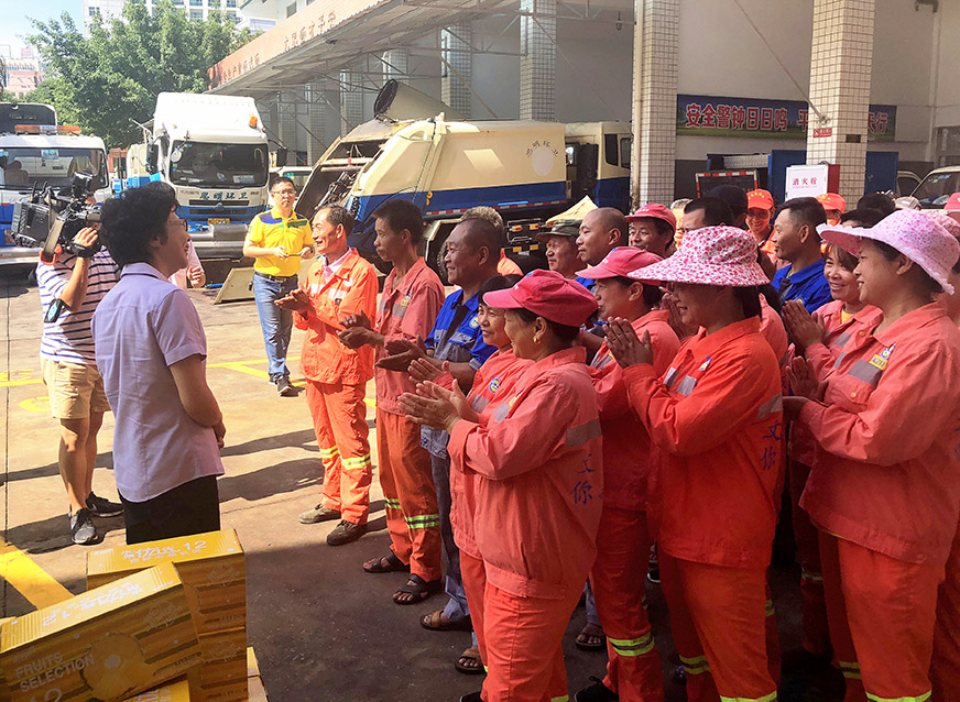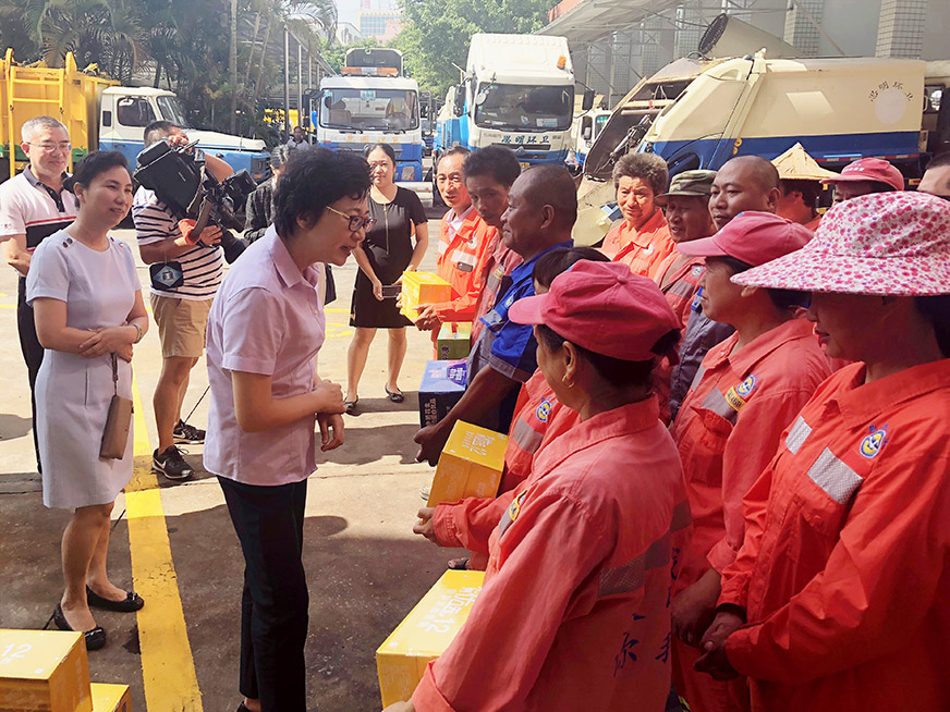 7月4日上午,廈門(mén)市委常委、市總工會(huì)主席倪超一行到思環(huán)公司洪文車(chē)場(chǎng)慰問(wèn)環(huán)衛(wèi)工人,為戰(zhàn)酷暑的工人送去防暑降溫藥品、飲料,送去深情問(wèn)候。