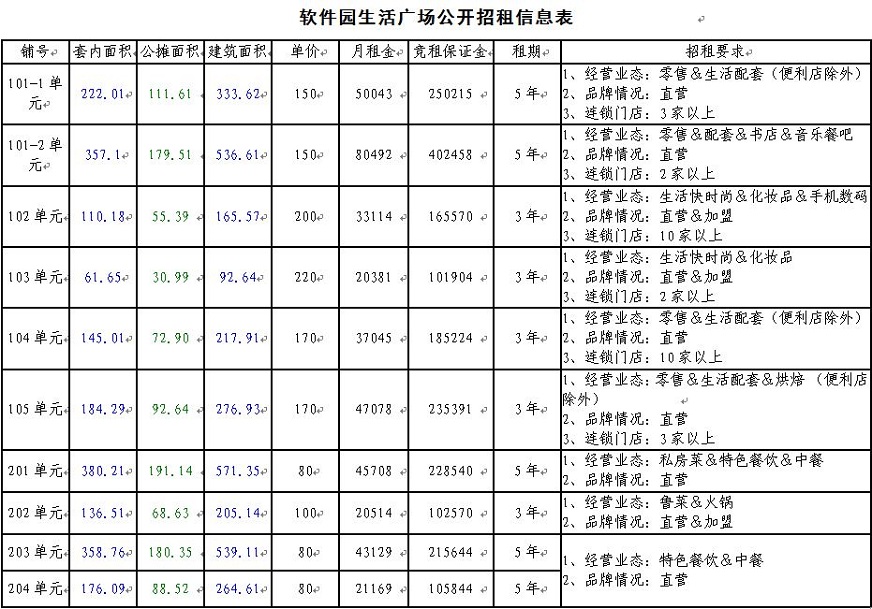 3、用途:商業(yè)(業(yè)態(tài)) ,招租要求:詳見附表(軟件園生活廣場(chǎng)公開招租信息表)