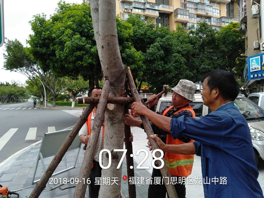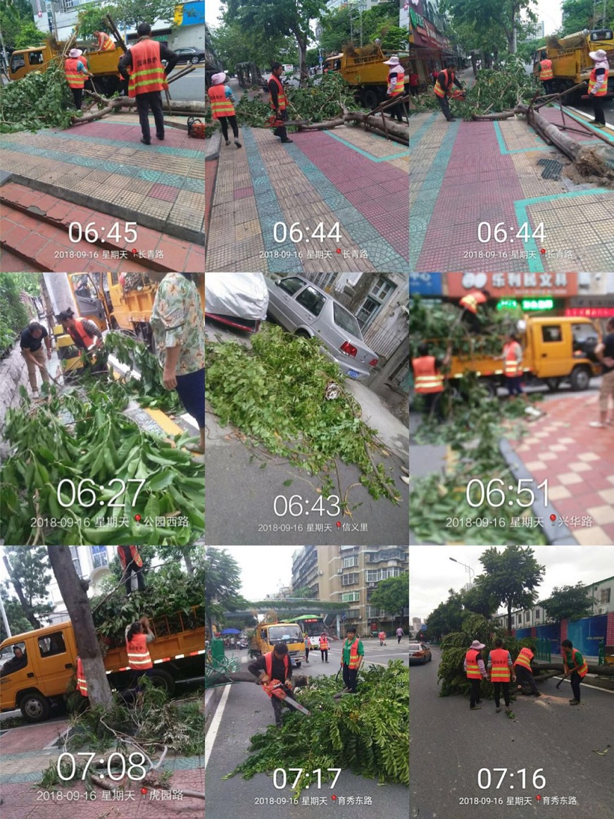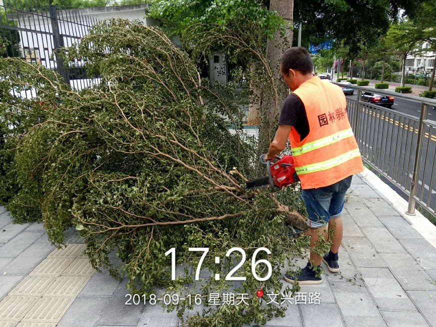 9月15日上午,氣象局發(fā)布“臺(tái)風(fēng)預(yù)警Ⅲ級(jí)”,我司迅速響應(yīng),綠化部人員第一時(shí)間抵達(dá)一線,確保隊(duì)伍、設(shè)備以及防護(hù)措施全部準(zhǔn)備就緒。同時(shí),組織工作人員對(duì)轄區(qū)內(nèi)淺根系、樹冠龐大、枝葉過密的園林植物進(jìn)行重點(diǎn)排查,同步采取疏枝、立柱、綁扎、培土等防御措施,減少樹木應(yīng)對(duì)臺(tái)風(fēng)的受力面積,使防風(fēng)支架起到更好的支撐和保護(hù)作用。本次應(yīng)急搶險(xiǎn),我司共投入人力212人次,搶險(xiǎn)機(jī)動(dòng)車35部,加固樹木182棵,修剪樹木725棵,扶正倒樹傾斜樹29棵,對(duì)200多棵樹木的折枝進(jìn)行鋸除清理。