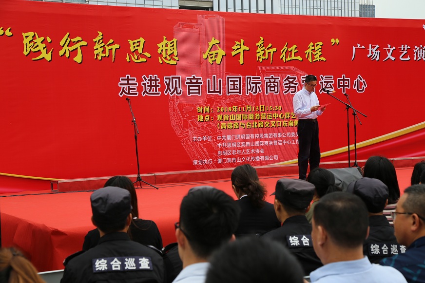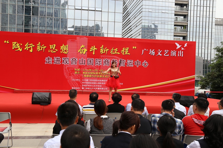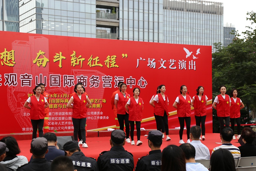 為深入學(xué)習(xí)貫徹習(xí)近平新時(shí)代中國(guó)特色社會(huì)主義思想,激勵(lì)園區(qū)企業(yè)以更加飽滿(mǎn)的精神風(fēng)貌,慶祝改革開(kāi)放40周年,接續(xù)奮斗,11月13日下午,由思明控股集團(tuán)黨委聯(lián)合觀音山黨工委、思明區(qū)老年人藝術(shù)協(xié)會(huì)共同舉辦“踐行新思想,奮斗新征程” ——學(xué)習(xí)習(xí)近平新時(shí)代中國(guó)特色社會(huì)主義思想廣場(chǎng)文藝演出。