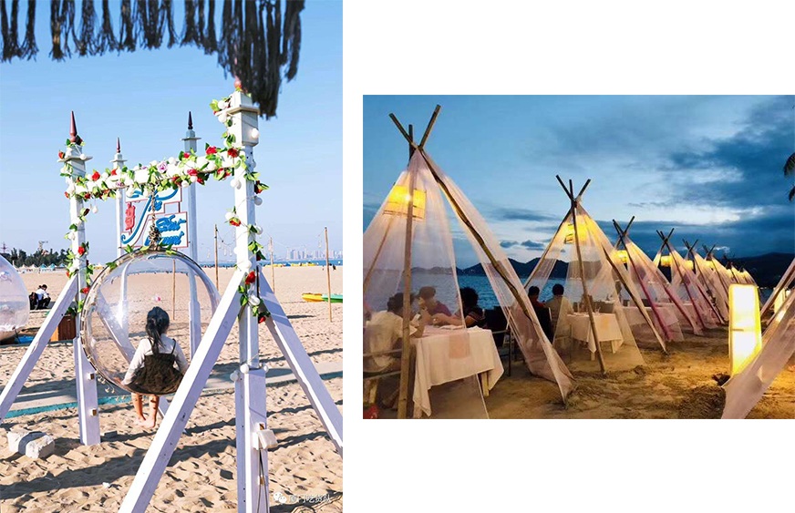 沙灘上浪漫而有趣的泡泡屋及帳篷,極具熱帶風(fēng)情的椰子樹(shù)等裝飾,過(guò)往行人無(wú)不駐足拍照,據(jù)說(shuō)這是觀音山在抖音上知名的“網(wǎng)紅地”,看似忽然爆紅的背后,它的創(chuàng)始人楊翰斌其實(shí)在觀音山這片“碧海金沙”中已5年有余,獨(dú)到的思維及眼光讓他從一批批不停更迭的商戶中脫穎而出,成了他在得天獨(dú)厚的環(huán)境中生存與“淘金”的制勝法寶。