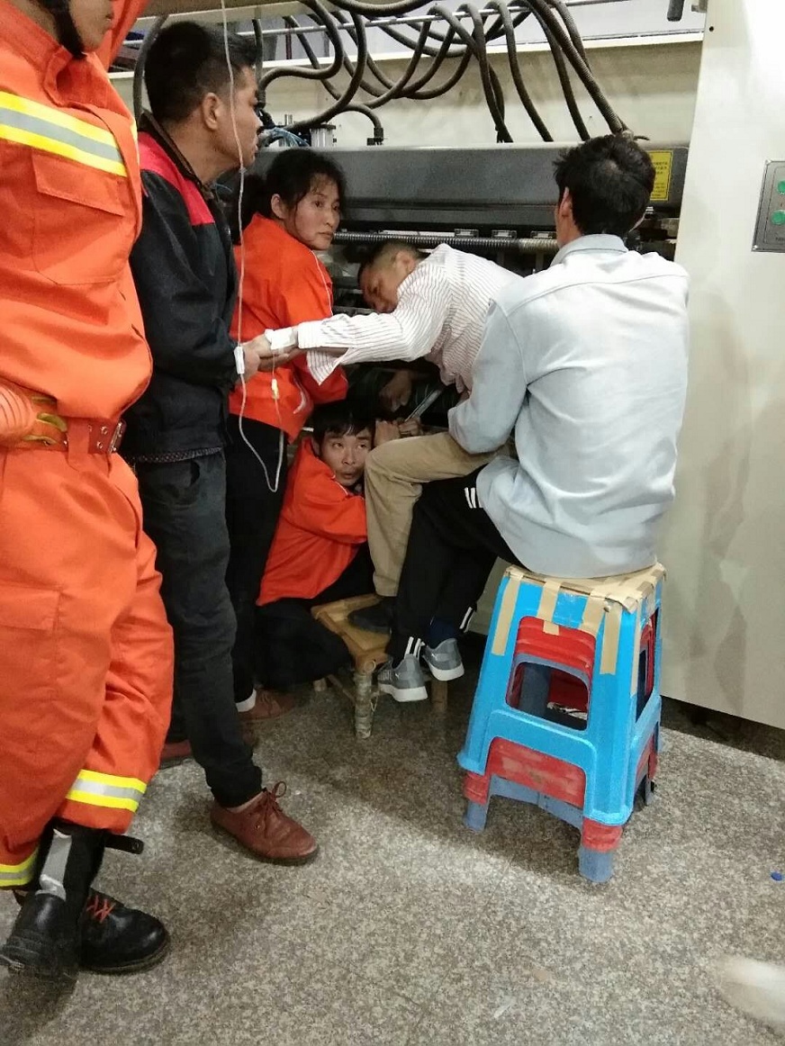 一個普通工人的手臂牽動著業(yè)主、物業(yè)管理人、消防官兵、120救援中心的心。因為機臺大,切割產(chǎn)生的高溫和火花易對傷者造成二次傷害,救援難度極大。救援小組迅速調(diào)整方案,用液壓擴張器將轉(zhuǎn)軸與機壁頂開,經(jīng)過半個多小時的不懈努力,傷者成功脫險,最終保住了手臂。